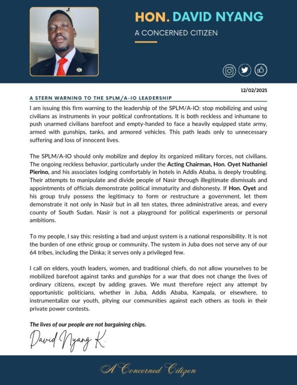 Hon. David Nyang has issued a strong warning to the leadership of the Sudan People’s Liberation Movement/Army-In Opposition (SPLM/A-IO), days after he resigned from a government position, condemning the mobilization of civilians to confront a better-armed state army in ongoing political and military power struggles. In his message, Nyang criticized the practice of pushing unarmed civilians, “barefoot and empty-handed,” to face government forces equipped with gunships, tanks, and armored personnel carriers, describing it as reckless and inhumane. He called on SPLM/A-IO to mobilize and deploy its organized forces instead of using ordinary people as human shields in what he termed a “war of positions.”